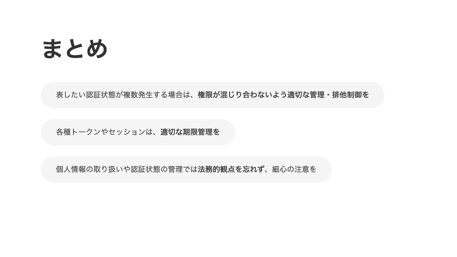 まとめ 表したい認証状態が複数発生する場合は、権限が混じり合わないよう適切な管理・排他制御を 各種トークンやセッションは、適切な期限管理を 個人情報の取り扱いや認証状態の管理では法務的観点を忘れず、細心の注意を
