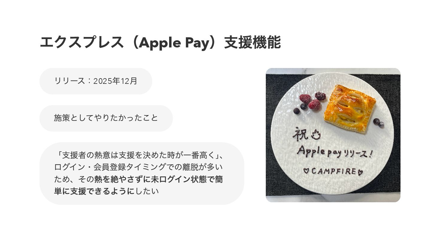 エクスプレス(Apple Pay )支援機能 リリース:2025 年12 月 施策としてやりたかったこと 「支援者の熱意は支援を決めた時が一番高く」 、 ログイン・会員登録タイミングでの離脱が多い