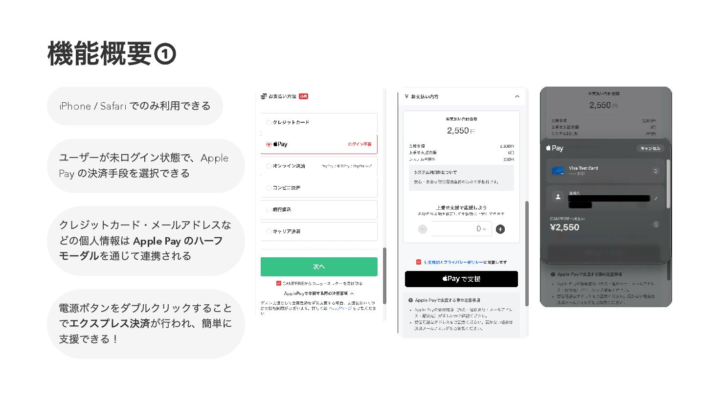 機能概要① iPhone / Safari でのみ利用できる ユーザーが未ログイン状態で、Apple Pay の決済手段を選択できる クレジットカード・メールアドレスな どの個人情報は