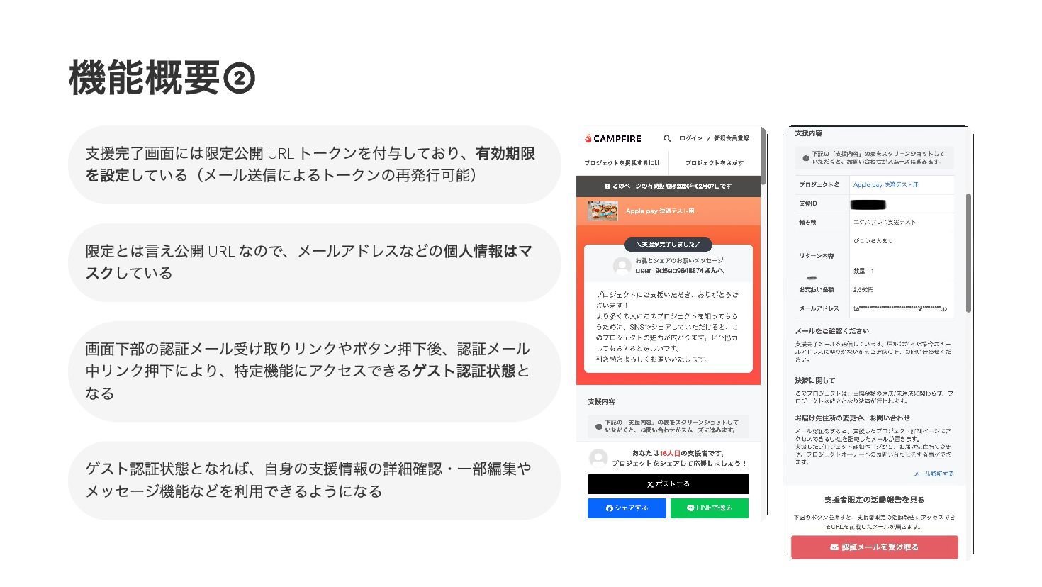 機能概要② 支援完了画面には限定公開 URL トークンを付与しており、有効期限 を設定している(メール送信によるトークンの再発行可能) 限定とは言え公開 URL なので、メールアドレスなどの個人情報はマ スクしている 画面下部の認証メール受け取りリンクやボタン押下後、認証メール