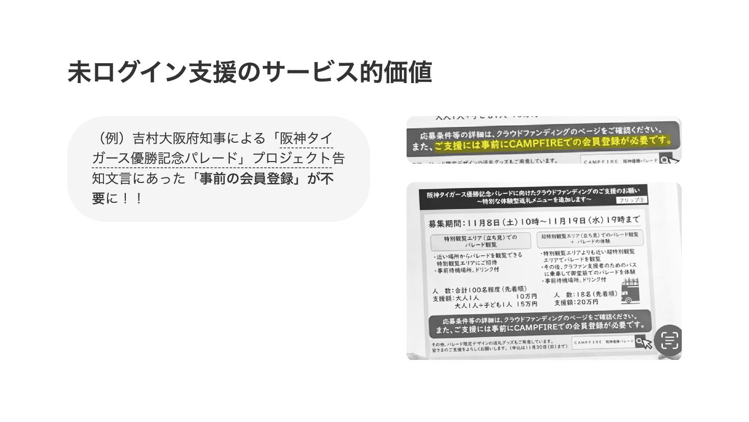 未ログイン支援のサービス的価値 (例)吉村大阪府知事による「阪神タイ ガース優勝記念パレード」プロジェクト告 知文言にあった「事前の会員登録」が不 要に!!