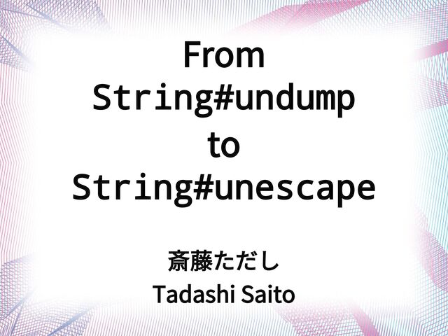 Video: https://youtu.be/hCZWrvO_27k (in Japanese) Moved/copied from: * https://www.slideshare.net/tadd/from-stringundump-to-stringunescape * https://niconare.nicovideo.jp/watch/kn3098
