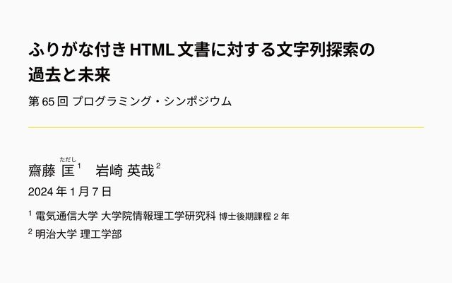 ふりがな付きHTML文書に対する文字列探索の 過去と未来 第 65 回 プログラミング・シンポジウム 齋藤 ただし 匡 1
