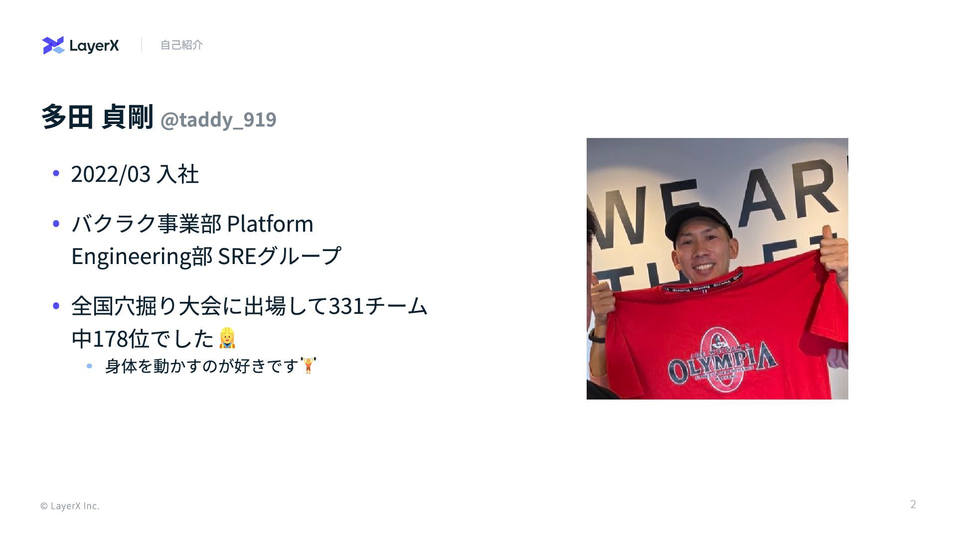 多田 貞剛 @taddy_919 自己紹介 2022/03 入社 バクラク事業部 Platform Engineering部 SREグループ