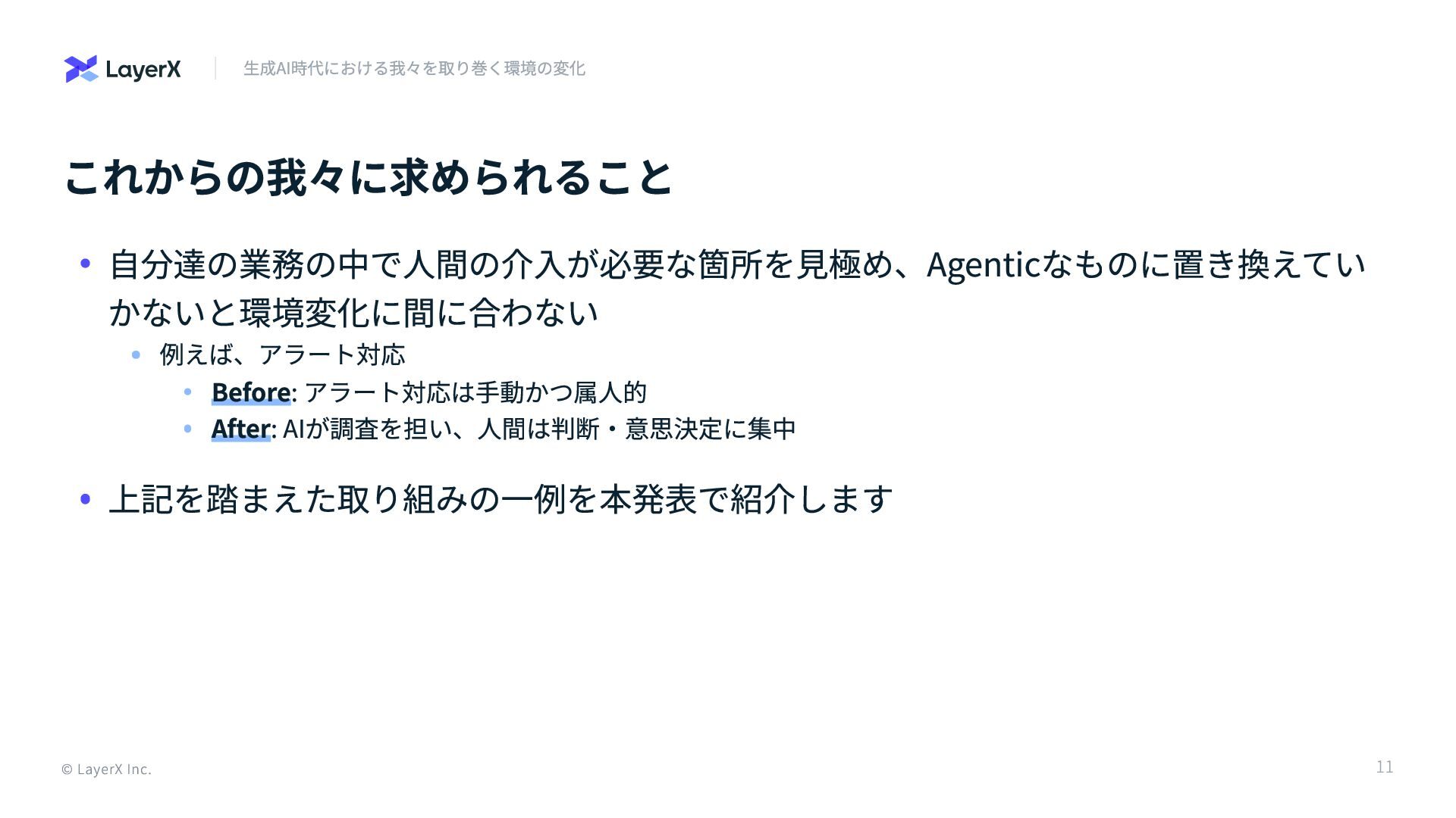 これからの我々に求められること © LayerX Inc. 生成AI時代における我々を取り巻く環境の変化 自分達の業務の中で人間の介入が必要な箇所を見極め、Agenticなものに置き換えてい かないと環境変化に間に合わない 例えば、アラート対応 Before: アラート対応は手動かつ属人的