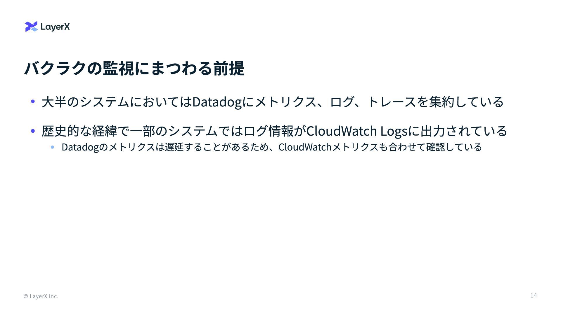 バクラクの監視にまつわる前提 © LayerX Inc. 大半のシステムにおいてはDatadogにメトリクス、ログ、トレースを集約している 歴史的な経緯で一部のシステムではログ情報がCloudWatch Logsに出力されている Datadogのメトリクスは遅延することがあるため、CloudWatchメトリクスも合わせて確認している 14