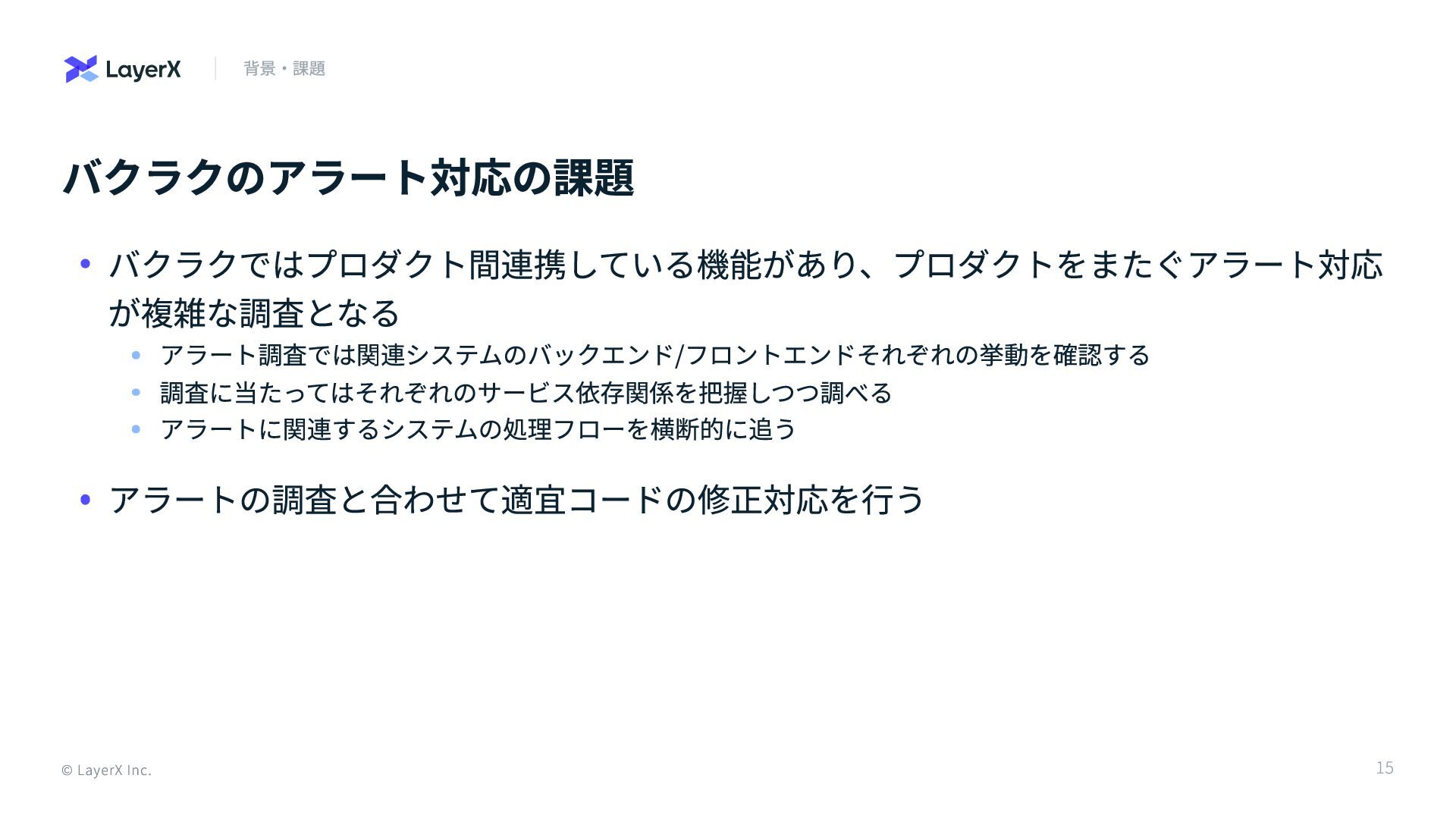 バクラクのアラート対応の課題 © LayerX Inc. 背景・課題 バクラクではプロダクト間連携している機能があり、プロダクトをまたぐアラート対応 が複雑な調査となる アラート調査では関連システムのバックエンド/フロントエンドそれぞれの挙動を確認する 調査に当たってはそれぞれのサービス依存関係を把握しつつ調べる アラートに関連するシステムの処理フローを横断的に追う