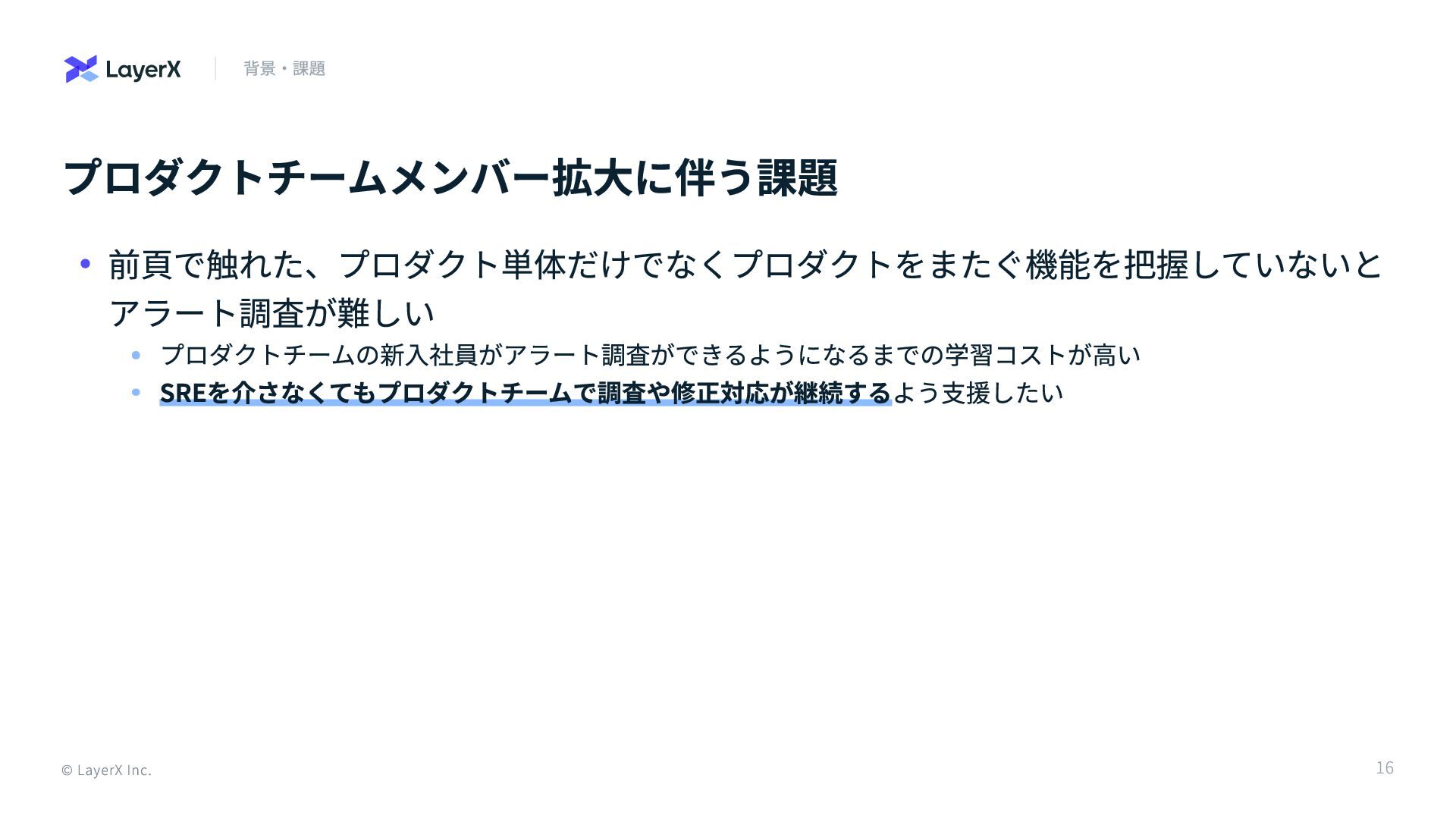 プロダクトチームメンバー拡大に伴う課題 © LayerX Inc. 背景・課題 前頁で触れた、プロダクト単体だけでなくプロダクトをまたぐ機能を把握していないと アラート調査が難しい プロダクトチームの新入社員がアラート調査ができるようになるまでの学習コストが高い SREを介さなくてもプロダクトチームで調査や修正対応が継続するよう支援したい 16