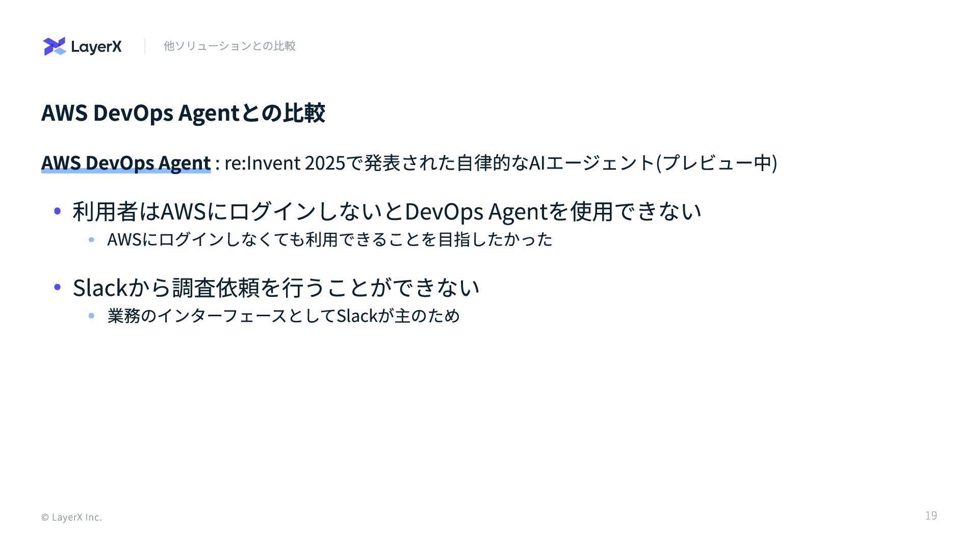 LayerX Inc. 他ソリューションとの比較 利用者はAWSにログインしないとDevOps Agentを使用できない AWSにログインしなくても利用できることを目指したかった Slackから調査依頼を行うことができない 業務のインターフェースとしてSlackが主のため 19