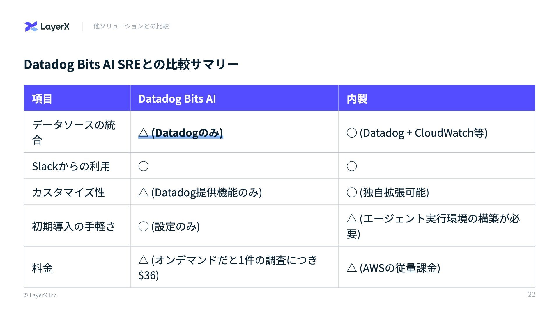 © LayerX Inc. 他ソリューションとの比較 バクラクの大半のメトリクス、ログ、トレース情報はDatadogに集まってくるが、一部 Datadog外の情報(CloudWatch)を必要とする場合もある 全ての調査がBits AI SREで完結できるわけではなく、AWSにエージェントを配置し、Datadogの調査はMCP経由 で行うことにした 21