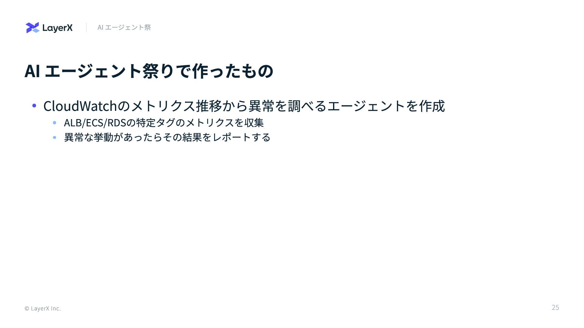 AI エージェント祭りで作ったもの © LayerX Inc. AI エージェント祭 CloudWatchのメトリクス推移から異常を調べるエージェントを作成 ALB/ECS/RDSの特定タグのメトリクスを収集 異常な挙動があったらその結果をレポートする