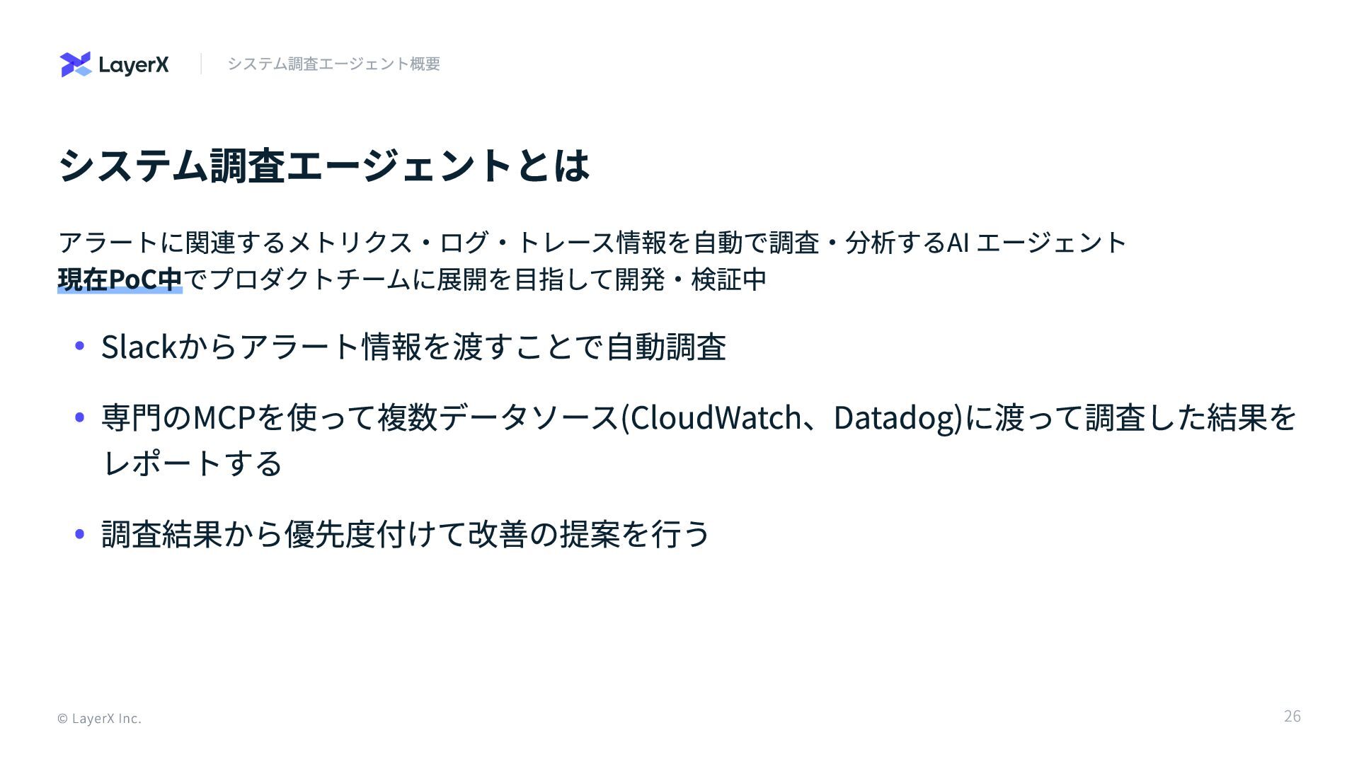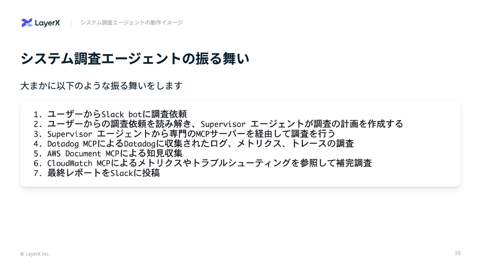 システム調査エージェントとは アラートに関連するメトリクス・ログ・トレース情報を自動で調査・分析するAI エージェント 現在PoC中でプロダクトチームに展開を目指して開発・検証中 © LayerX Inc. システム調査エージェント概要 Slackからアラート情報を渡すことで自動調査 専門のMCPを使って複数データソース(CloudWatch、Datadog)に渡って調査した結果を