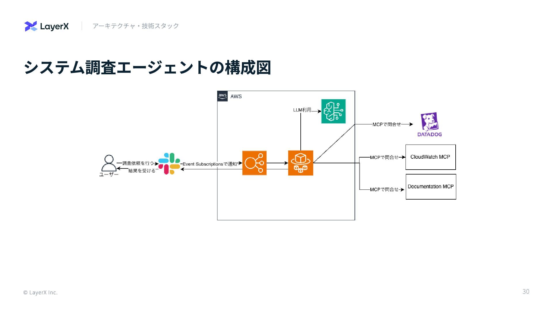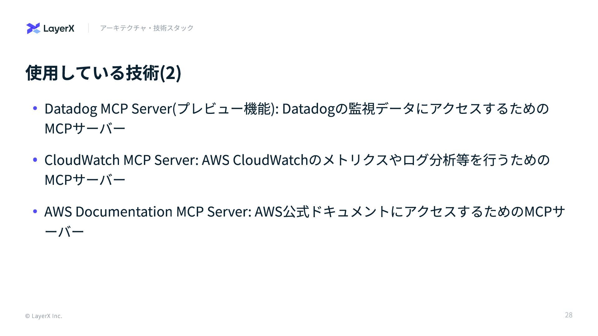 使用している技術(2) © LayerX Inc. アーキテクチャ・技術スタック Datadog MCP Server(プレビュー機能): Datadogの監視データにアクセスするための MCPサーバー