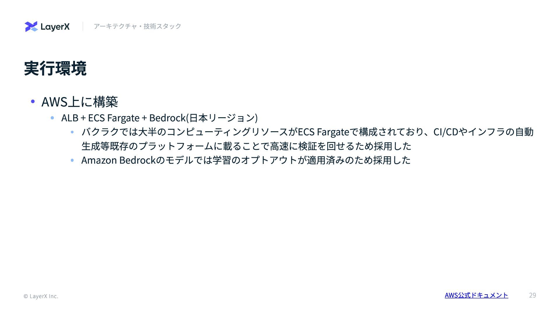 + Bedrock(日本リージョン) バクラクでは大半のコンピューティングリソースがECS Fargateで構成されており、CI/CDやインフラの自動 生成等既存のプラットフォームに載ることで高速に検証を回せるため採用した Amazon Bedrockのモデルでは学習のオプトアウトが適用済みのため採用した AWS公式ドキュメント 29