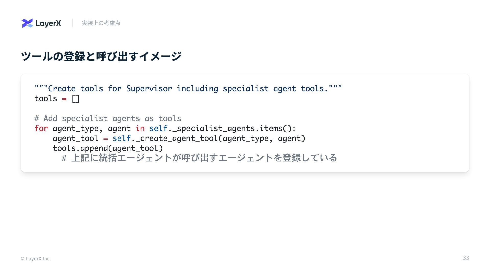 ツールの登録と呼び出すイメージ © LayerX Inc. 実装上の考慮点 33