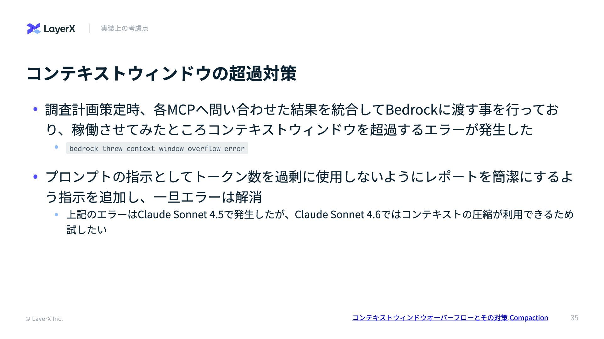 コンテキストウィンドウの超過対策 © LayerX Inc. 実装上の考慮点 調査計画策定時、各MCPへ問い合わせた結果を統合してBedrockに渡す事を行ってお り、稼働させてみたところコンテキストウィンドウを超過するエラーが発生した bedrock threw context