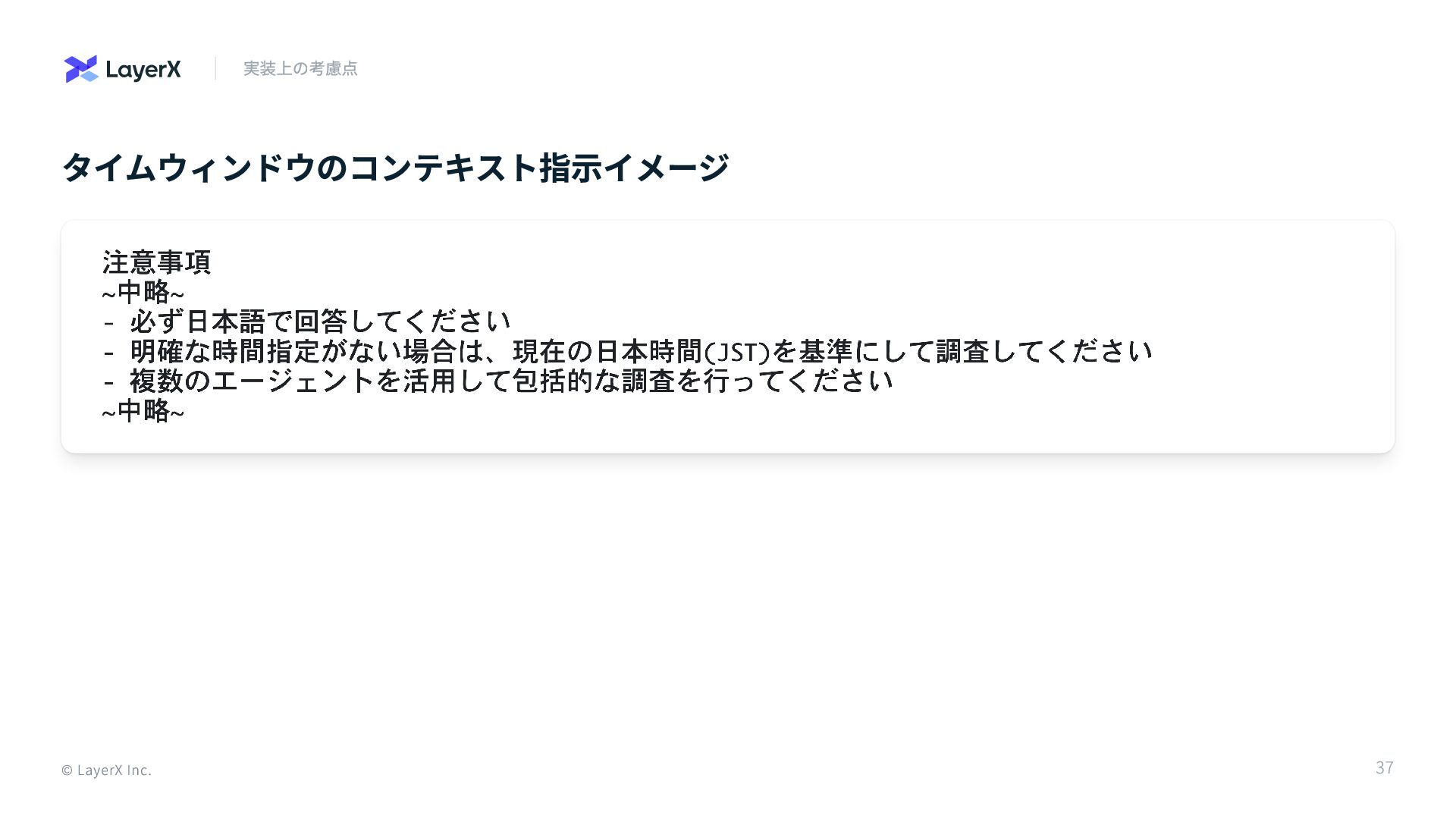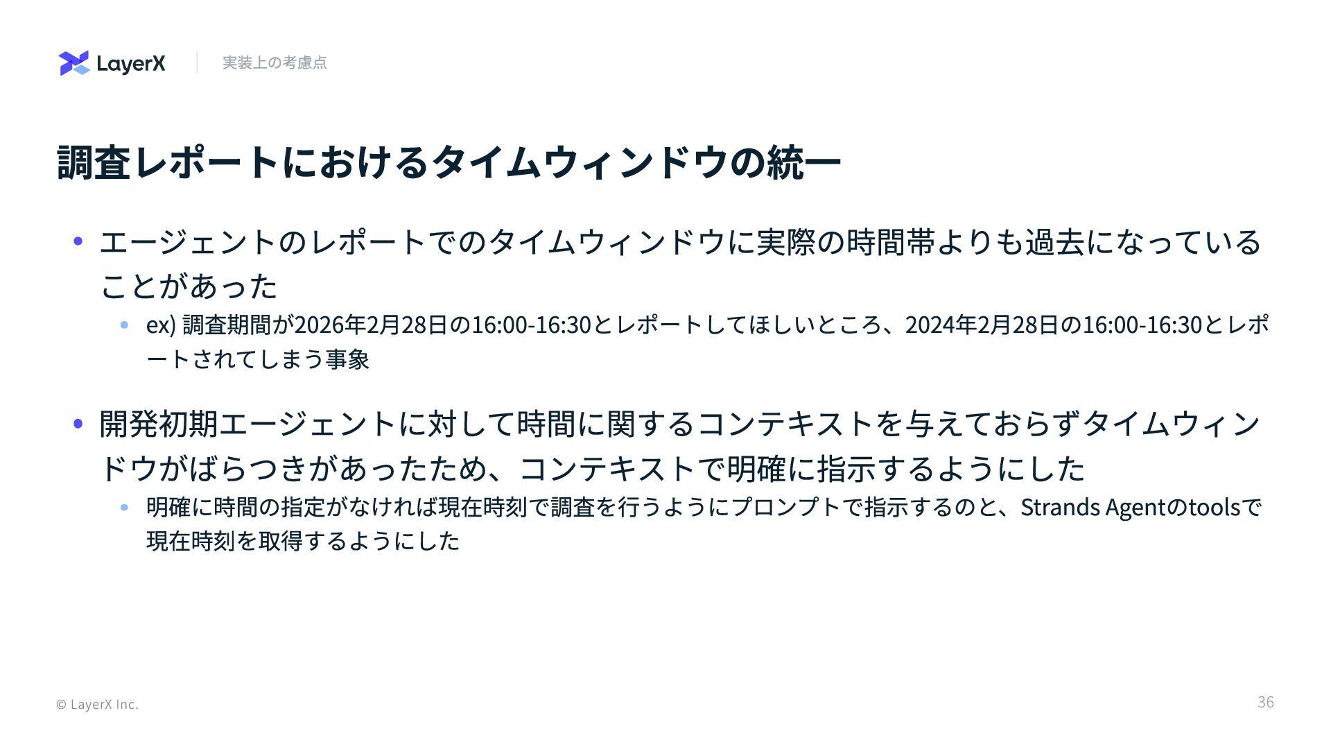 調査レポートにおけるタイムウィンドウの統一 © LayerX Inc. 実装上の考慮点 エージェントのレポートでのタイムウィンドウに実際の時間帯よりも過去になっている ことがあった ex) 調査期間が2026年2月28日の16:00-16:30とレポートしてほしいところ、2024年2月28日の16:00-16:30とレポ ートされてしまう事象