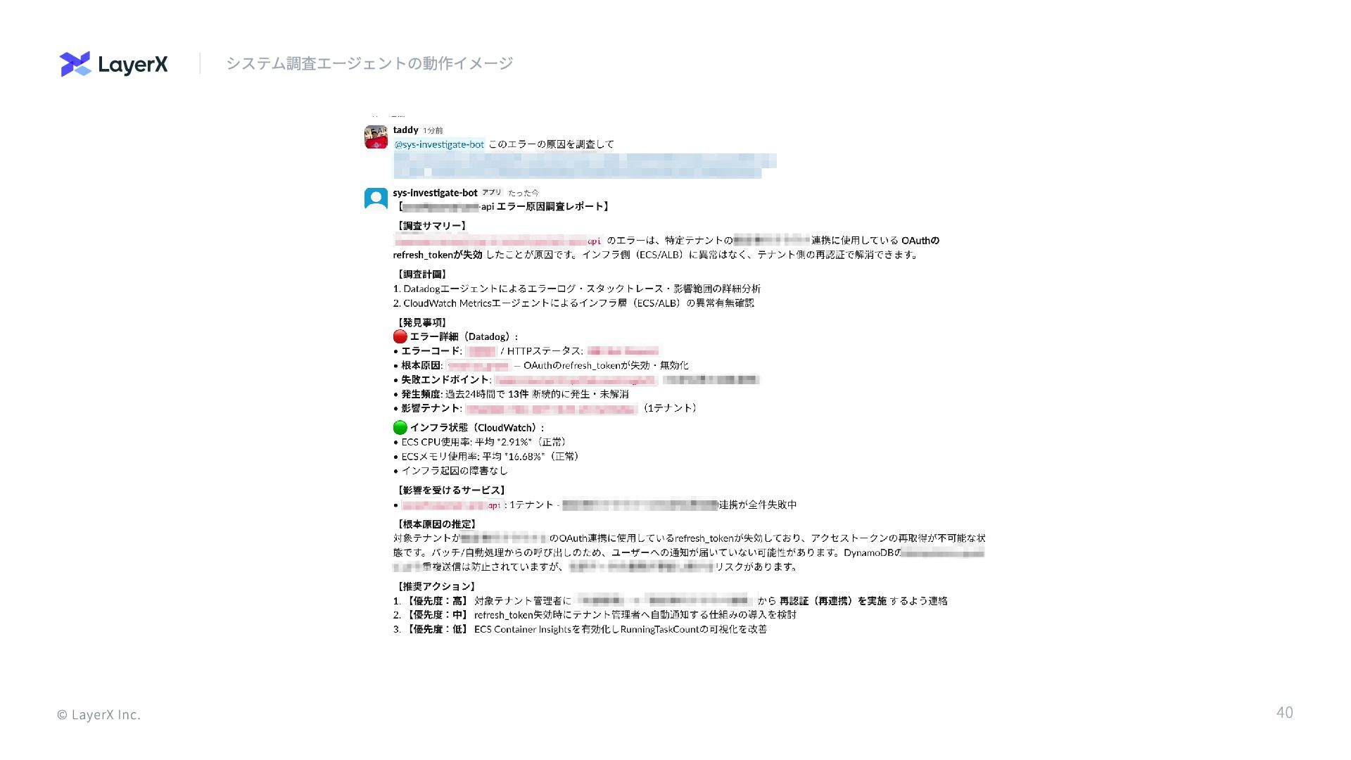 システム調査エージェントの動作イメージ © LayerX Inc. 40