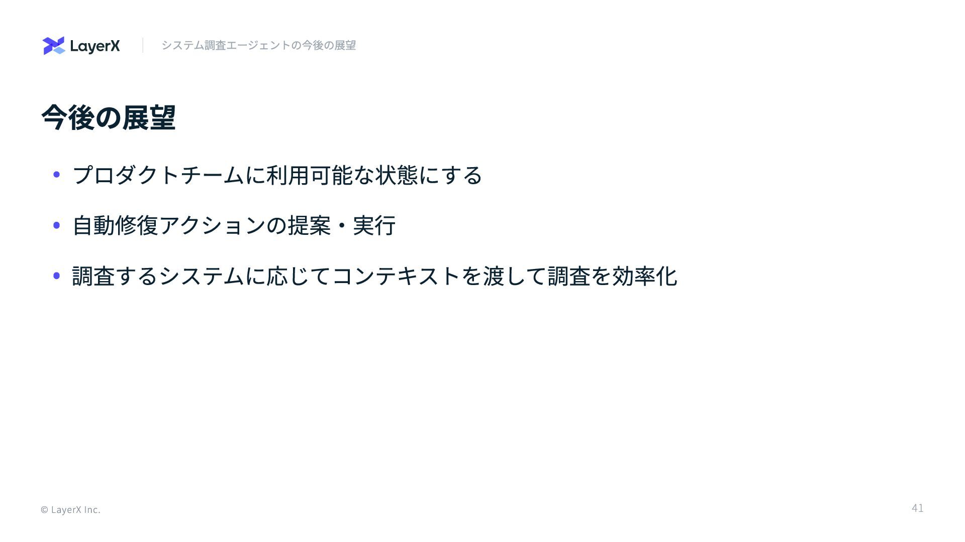今後の展望 © LayerX Inc. システム調査エージェントの今後の展望 プロダクトチームに利用可能な状態にする 自動修復アクションの提案・実行 調査するシステムに応じてコンテキストを渡して調査を効率化 41