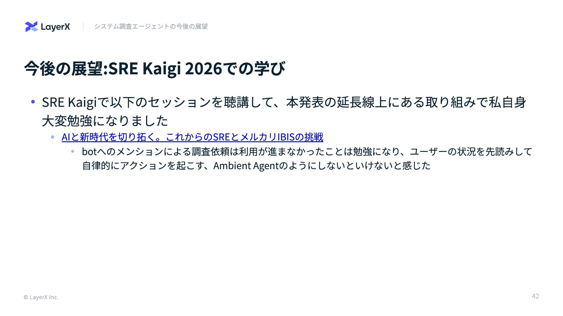 今後の展望:SRE Kaigi 2026での学び © LayerX Inc. システム調査エージェントの今後の展望 SRE Kaigiで以下のセッションを聴講して、本発表の延長線上にある取り組みで私自身 大変勉強になりました