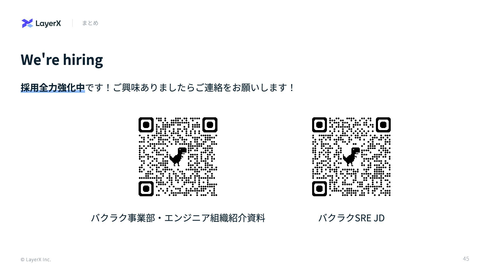 We're hiring 採用全力強化中です!ご興味ありましたらご連絡をお願いします! バクラク事業部・エンジニア組織紹介資料 バクラクSRE JD © LayerX Inc. まとめ