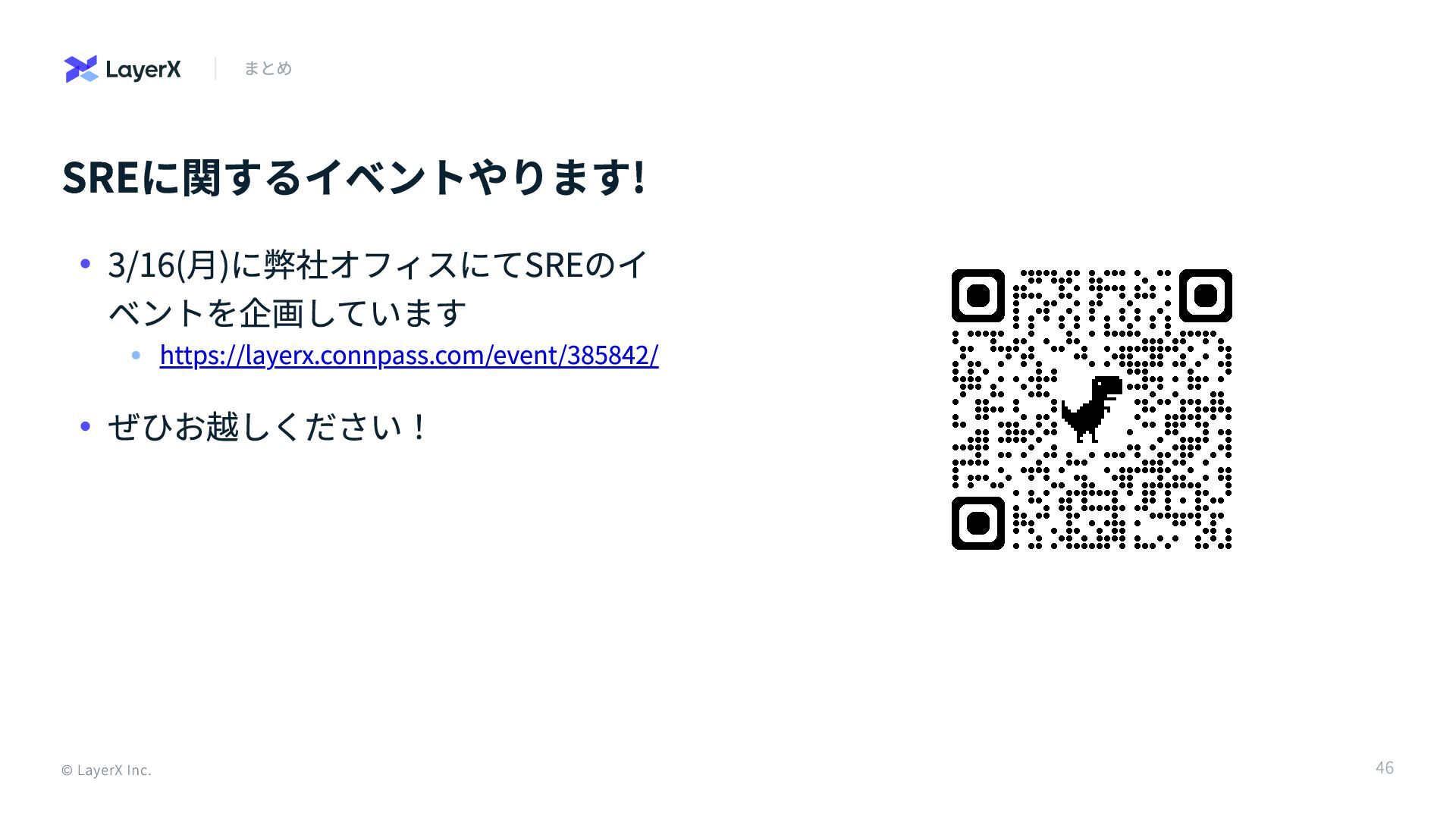 SREに関するイベントやります! まとめ 3/16(月)に弊社オフィスにてSREのイ ベントを企画しています https://layerx.connpass.com/event/385842/ ぜひお越しください! © LayerX Inc. 46