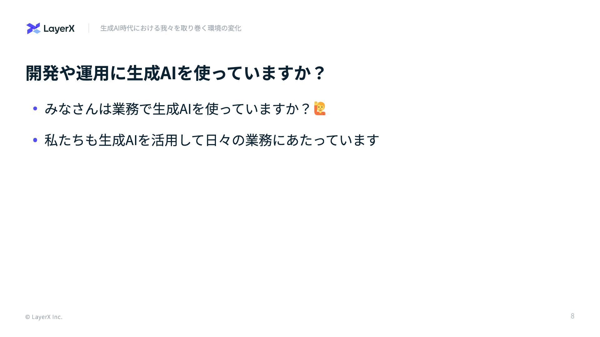 開発や運用に生成AIを使っていますか? © LayerX Inc. 生成AI時代における我々を取り巻く環境の変化 みなさんは業務で生成AIを使っていますか? 私たちも生成AIを活用して日々の業務にあたっています 8