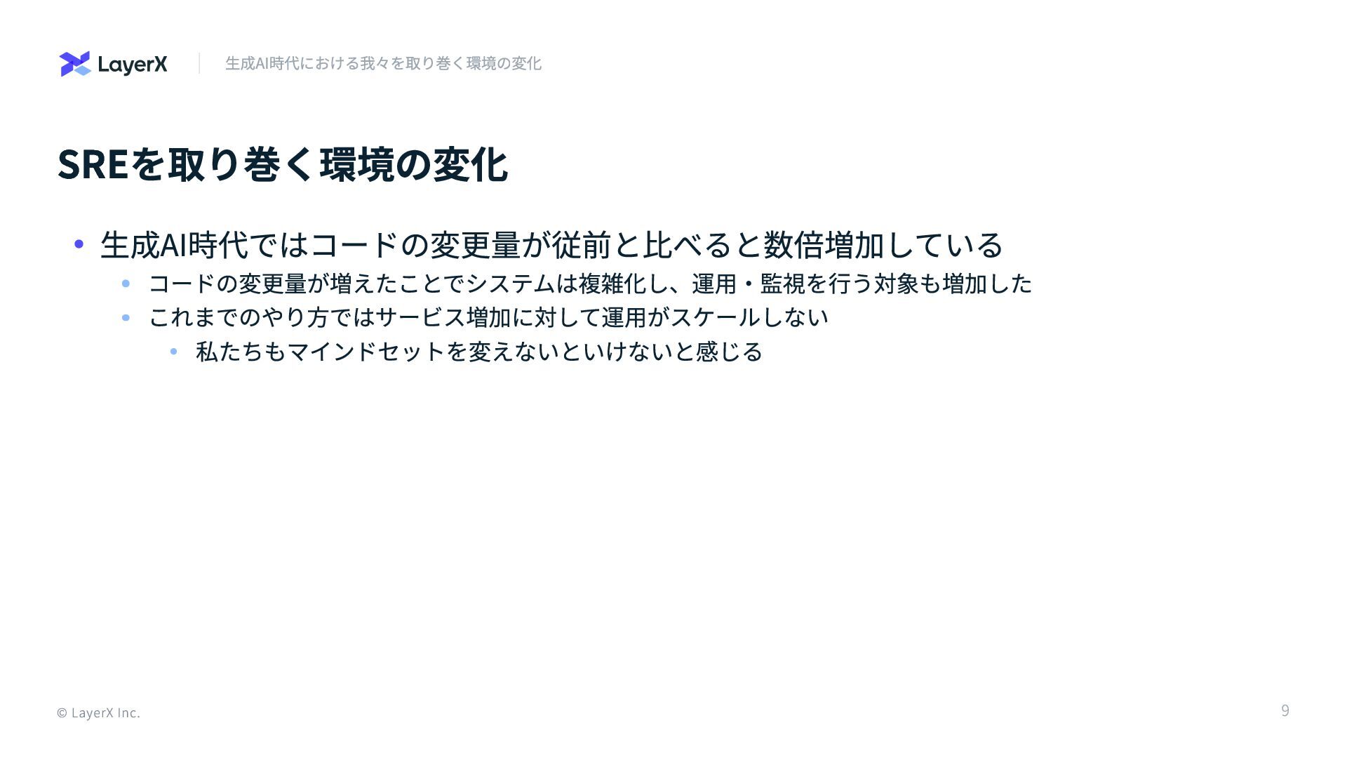 SREを取り巻く環境の変化 © LayerX Inc. 生成AI時代における我々を取り巻く環境の変化 生成AI時代ではコードの変更量が従前と比べると数倍増加している コードの変更量が増えたことでシステムは複雑化し、運用・監視を行う対象も増加した これまでのやり方ではサービス増加に対して運用がスケールしない 私たちもマインドセットを変えないといけないと感じる 9