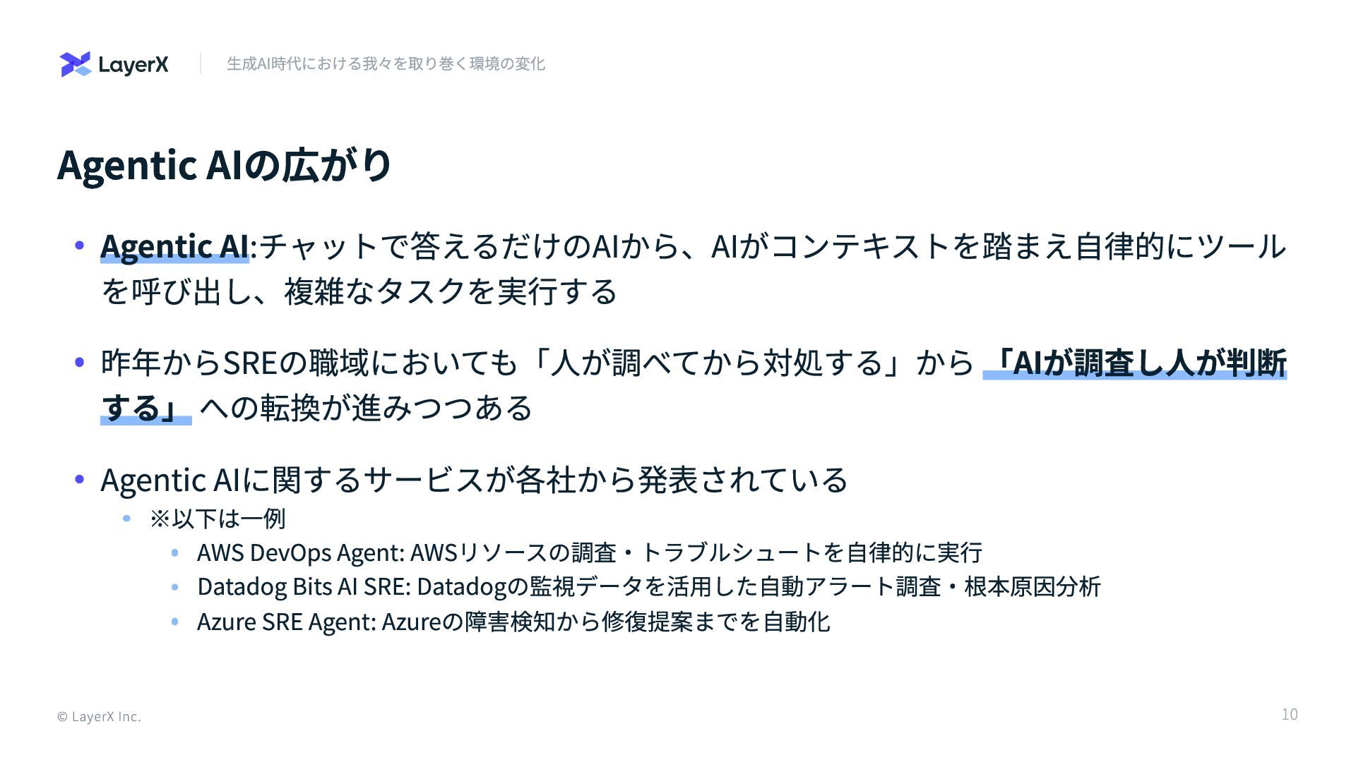 Agentic AIの広がり © LayerX Inc. 生成AI時代における我々を取り巻く環境の変化 Agentic AI:チャットで答えるだけのAIから、AIがコンテキストを踏まえ自律的にツール を呼び出し、複雑なタスクを実行する 昨年からSREの職域においても「人が調べてから対処する」から