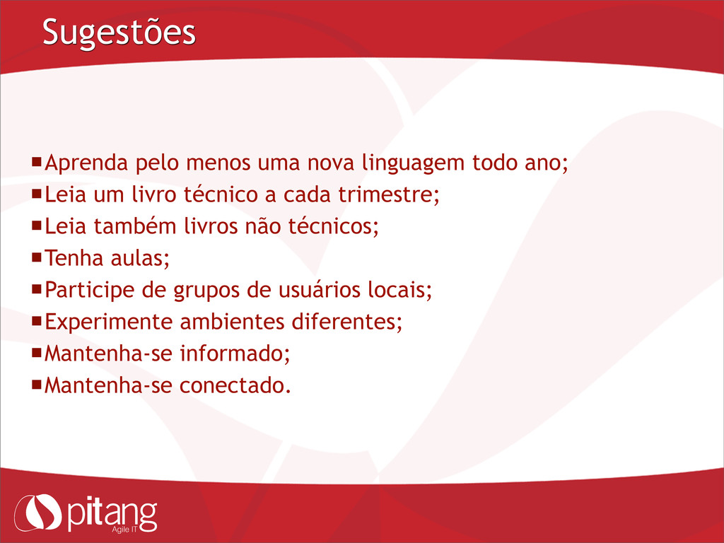 um livro técnico a cada trimestre; Leia também livros não técnicos; Tenha aulas; Participe de grupos de usuários locais; Experimente ambientes diferentes; Mantenha-se informado; Mantenha-se conectado.