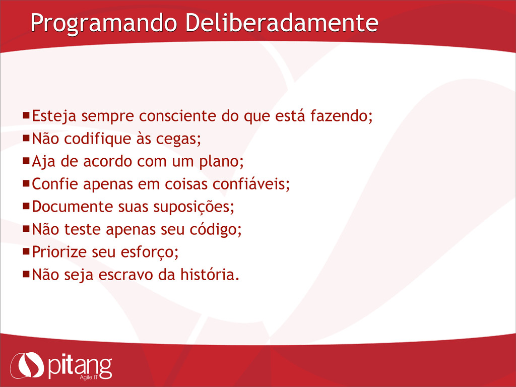 codifique às cegas; Aja de acordo com um plano; Confie apenas em coisas confiáveis; Documente suas suposições; Não teste apenas seu código; Priorize seu esforço; Não seja escravo da história.