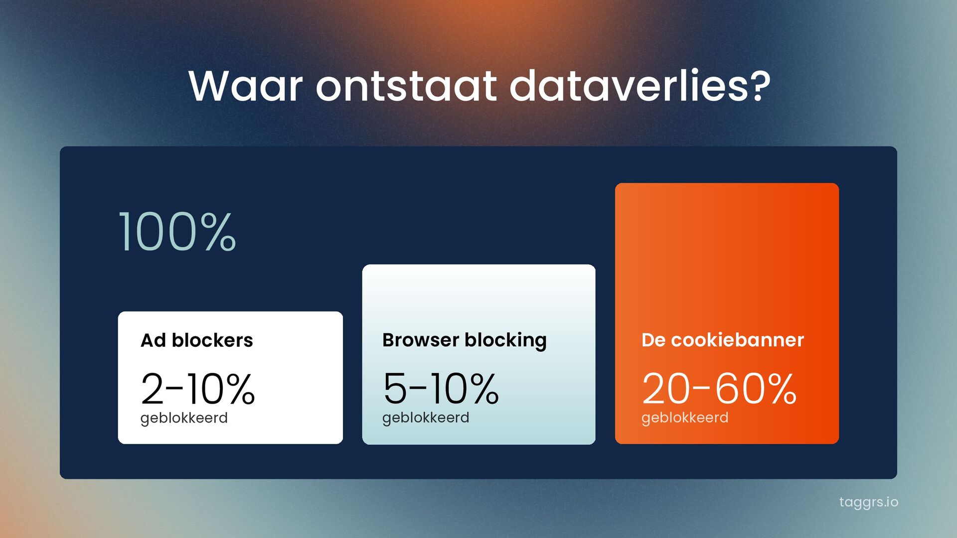 taggrs.io Waar ontstaat dataverlies? 20-60% geblokkeerd 100% De cookiebanner 2-10%