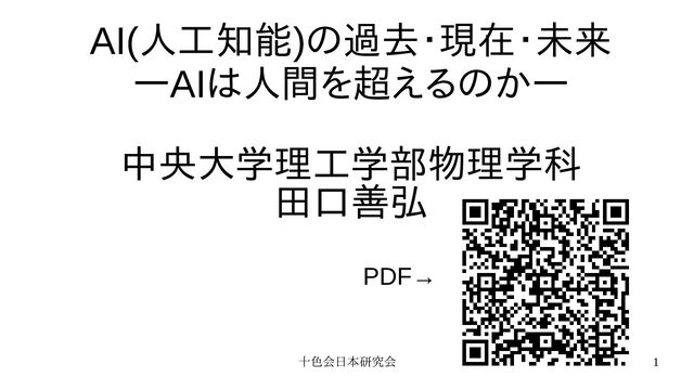 十色会日本研究会 1 AI(人工知能)の過去・現在・未来 —AIは人間を超えるのか— 中央大学理工学部物理学科 田口善弘 PDF→
