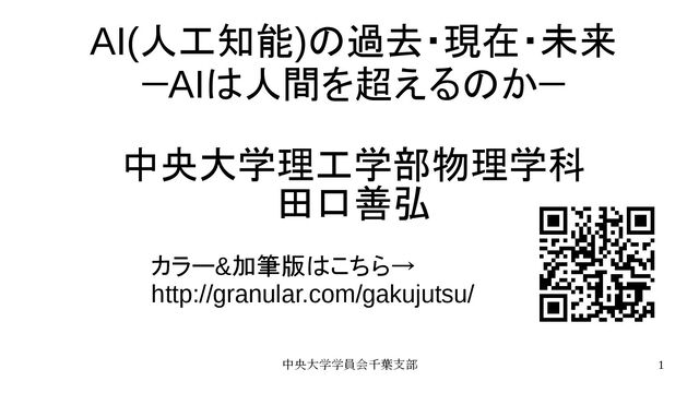 中央大学学員会千葉支部 1 AI(人工知能)の過去・現在・未来 —AIは人間を超えるのか— 中央大学理工学部物理学科 田口善弘 カラー&加筆版はこちら→ http://granular.com/gakujutsu/