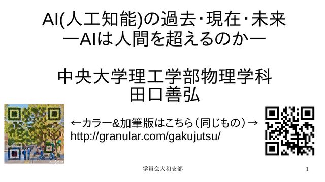 学員会大和支部 1 AI(人工知能)の過去・現在・未来 —AIは人間を超えるのか— 中央大学理工学部物理学科 田口善弘 ←カラー&加筆版はこちら(同じもの)→ http://granular.com/gakujutsu/