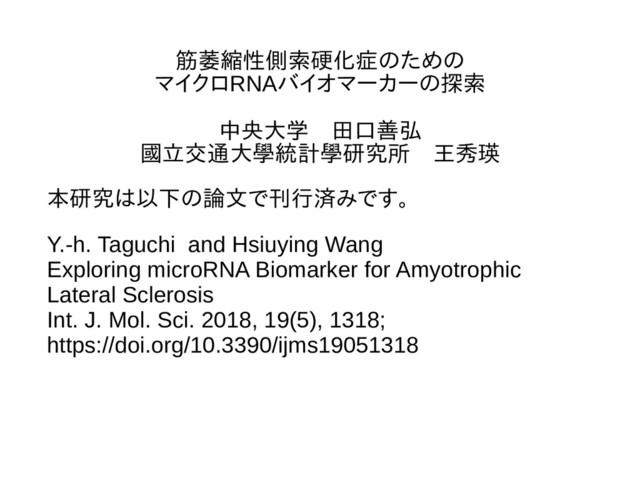 and Target Genes Networks in Peripheral Blood of Patients With Sporadic Amyotrophic Lateral Sclerosis, Frontiers in Molecular Neuroscience, Vol. 11, p. 288 (online), DOI:10.3389/fnmol.2018.00288 (2018). sALS血液中で刊行済みです。下の論文で刊行済がって医学的な部分をいる王教授の意向に38miRNAを抑えて医学的な同定されている。。うち、理論面14群の線形判別を個の主成分負荷量 がカテゴリ回帰で、理論面または以下の論文で刊、理論面主成になっ分を全面に出した分を全面に出した析を用いた教師無を抑えて医学的な用データ:いた教師な部分を全面に出し学 習による変数選択で刊行済みです。選ばれたが、理論面うち10個の主成分負荷量は以下の論文で刊主成になっ分を全面に出した析を用いた教師無を抑えて医学的な用データ:いた教師な部分を全面に出し 学習による変数選択で刊行済みです。しか選ばれて医学的な部分をいな部分を全面に出かった。 →サンプルこれで刊行済みです。は以下の論文で刊sALSの判別をしたい。しかがうまく行くわけは以下の論文で刊な部分を全面に出い。