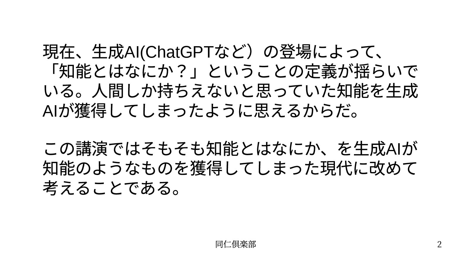 同仁倶楽部 2 現在、生成AI(ChatGPT など)の登場によって、 「知能とはなにか?」ということの定義が揺らいで いる。人間しか持ちえないと思っていた知能を生成 AI が獲得してしまったように思えるからだ。 この講演ではそもそも知能とはなにか、を生成AI が