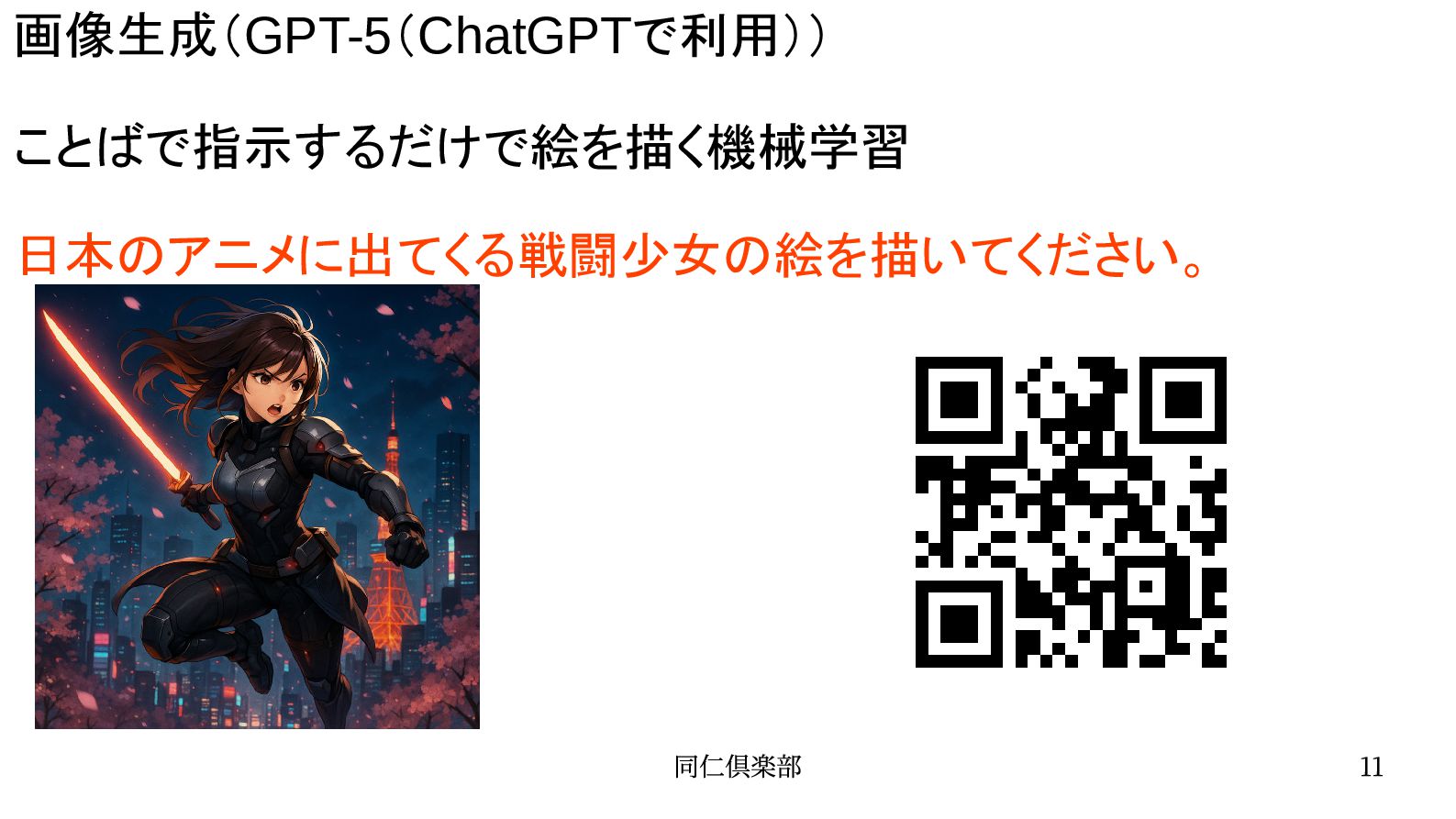 同仁倶楽部 11 画像生成(GPT-5(ChatGPTで利用)) ことばで指示するだけで絵を描く機械学習 日本のアニメに出てくる戦闘少女の絵を描いてください。