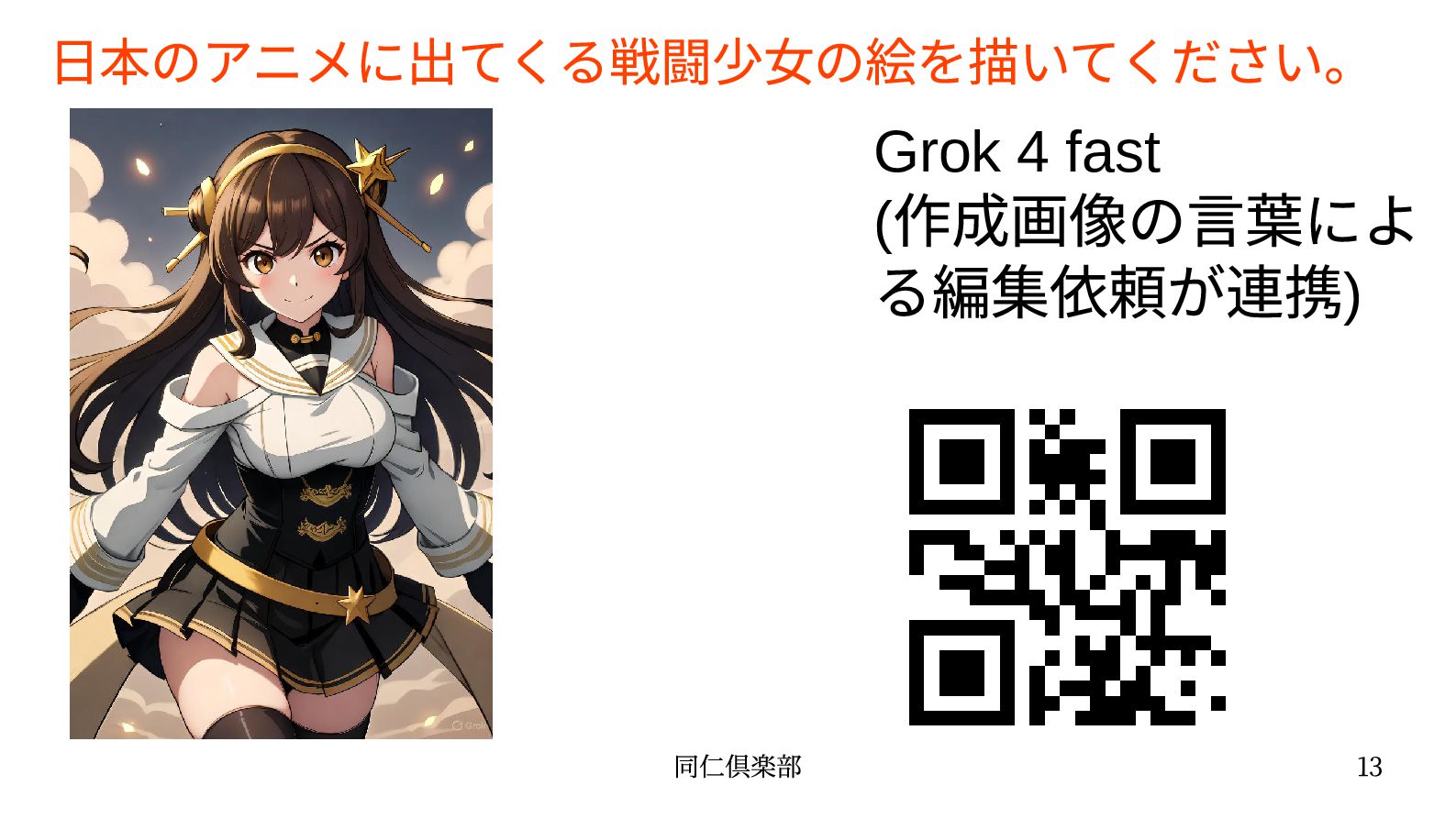 同仁倶楽部 13 日本のアニメに出てくる戦闘少女の絵を描いてください。 Grok 4 fast ( 作成画像の言葉によ る編集依頼が連携)