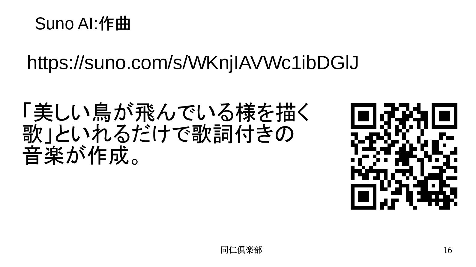 同仁倶楽部 16 Suno AI:作曲 https://suno.com/s/WKnjIAVWc1ibDGlJ 「美しい鳥が飛んでいる様を描く 歌」といれるだけで歌詞付きの 音楽が作成。