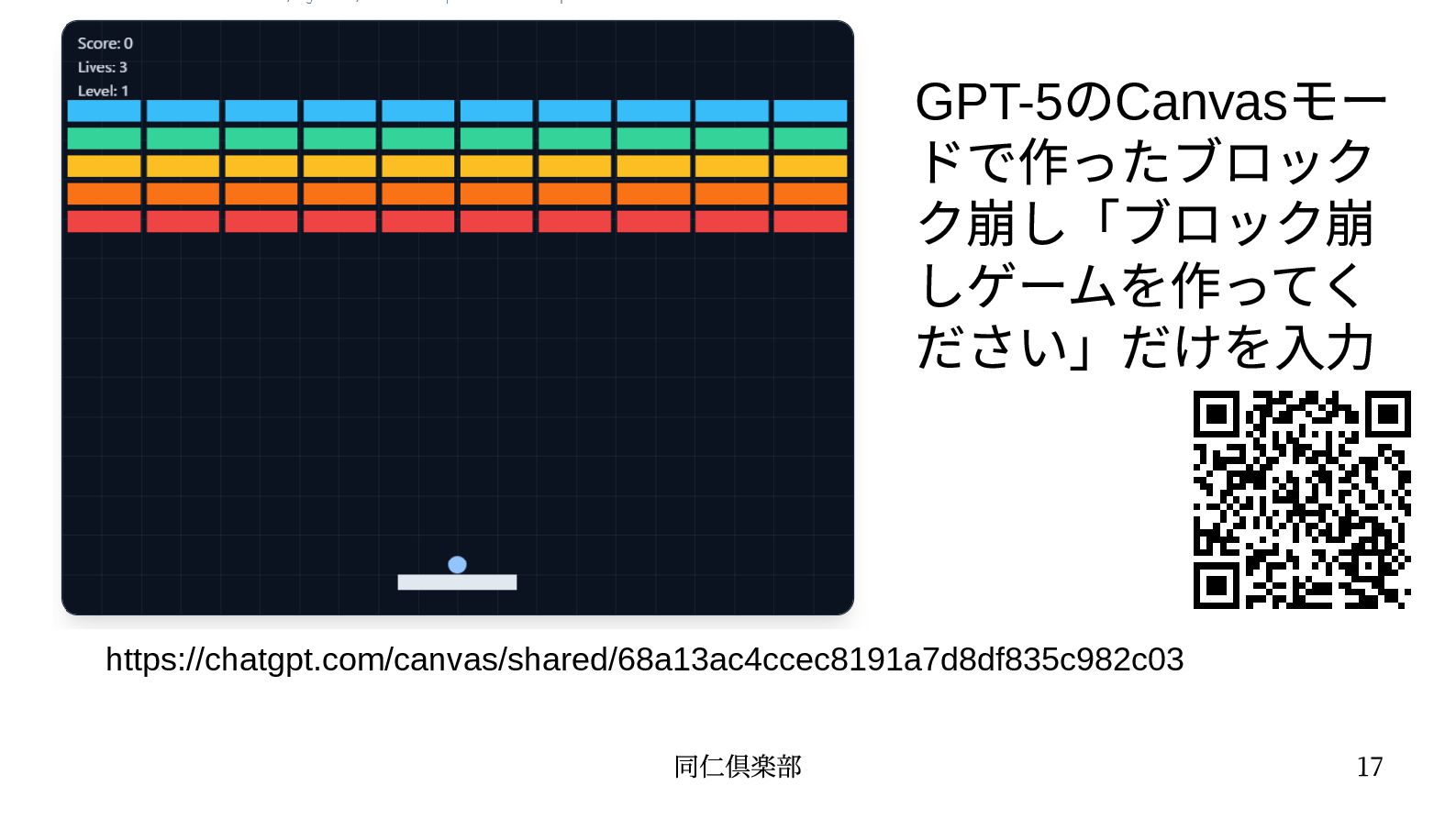 同仁倶楽部 17 https://chatgpt.com/canvas/shared/68a13ac4ccec8191a7d8df835c982c03 GPT-5 のCanvas モー ドで作ったブロック ク崩し「ブロック崩 しゲームを作ってく ださい」だけを入力