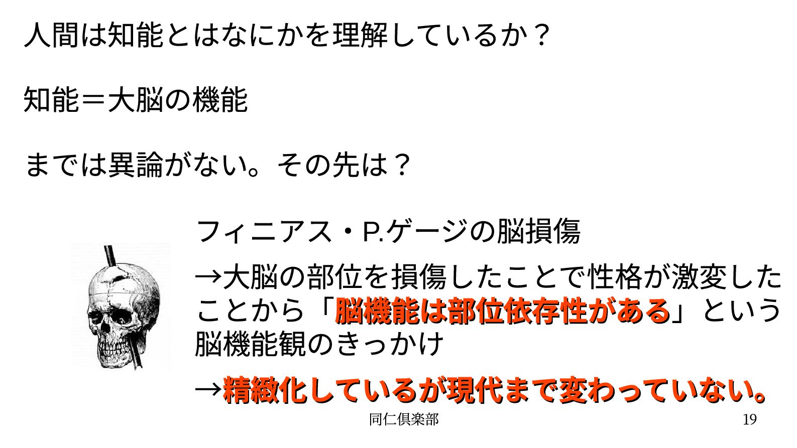 同仁倶楽部 19 人間は知能とはなにかを理解しているか? 知能=大脳の機能 までは異論がない。その先は? フィニアス・P. ゲージの脳損傷 →大脳の部位を損傷したことで性格が激変した ことから「脳機能は部位依存性がある 脳機能は部位依存性がある」という