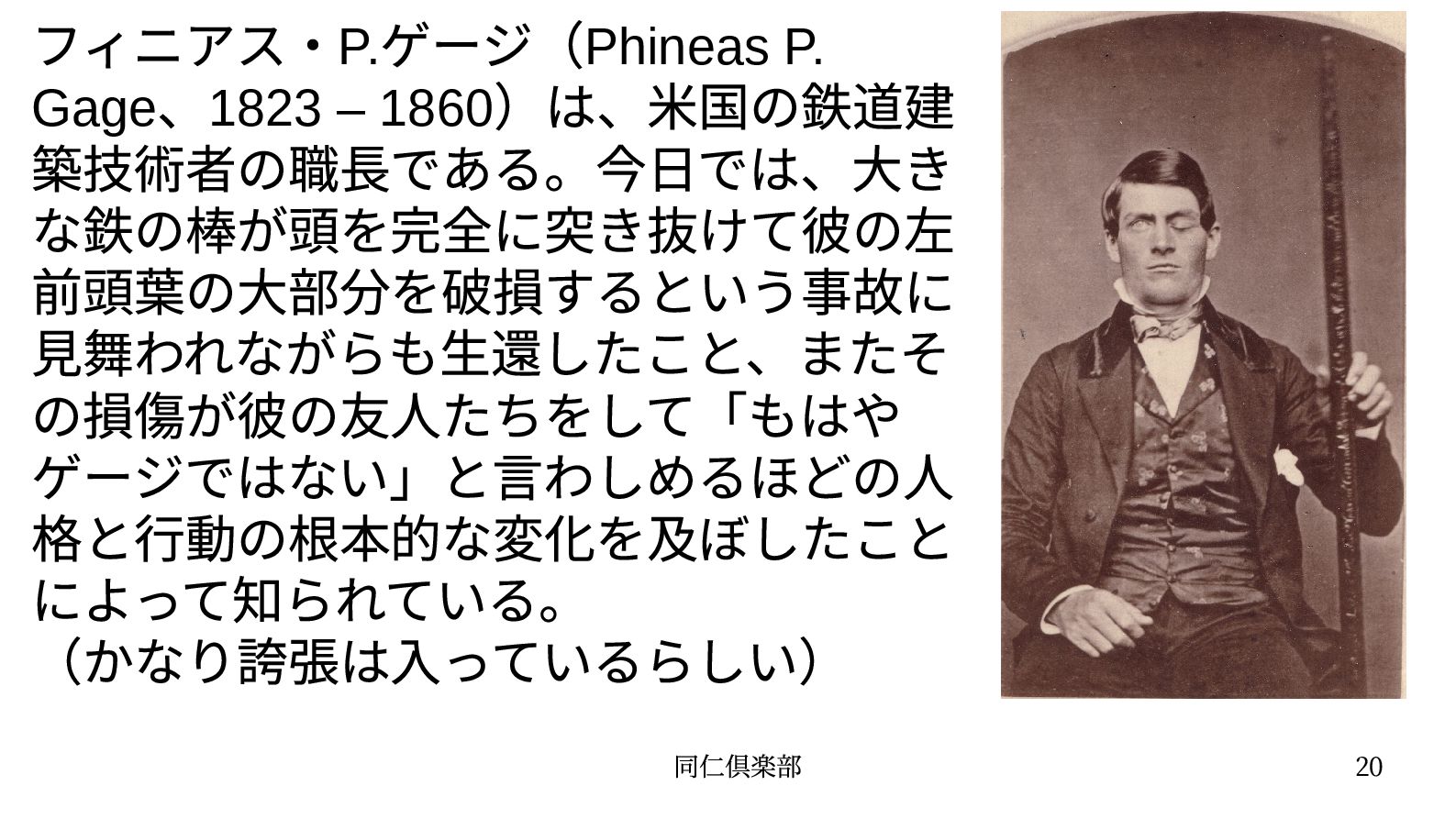 同仁倶楽部 20 フィニアス・P. ゲージ(Phineas P. Gage 、1823 – 1860 )は、米国の鉄道建