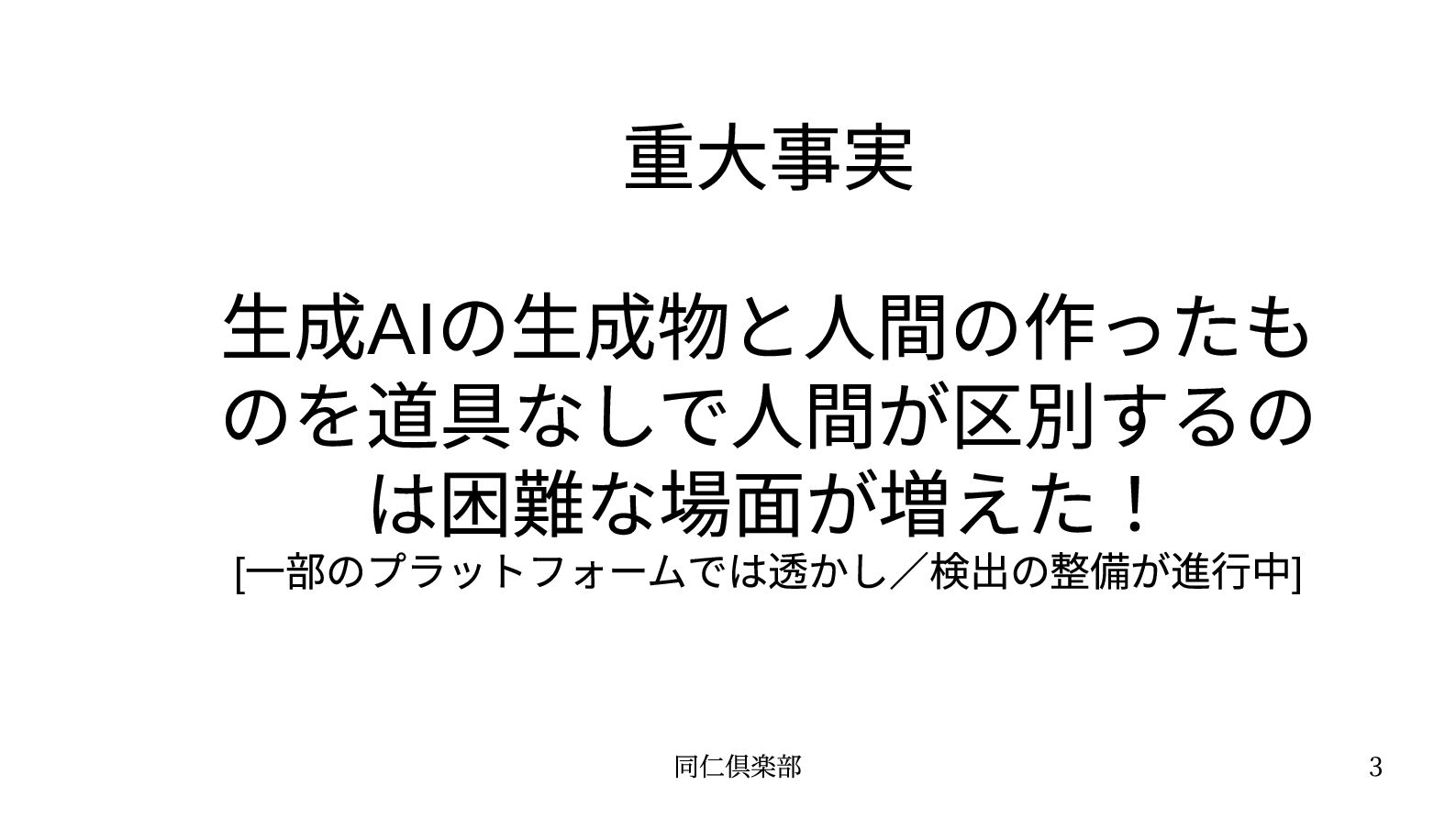 同仁倶楽部 3 重大事実 生成AI の生成物と人間の作ったも のを道具なしで人間が区別するの は困難な場面が増えた! [ 一部のプラットフォームでは透かし/検出の整備が進行中]