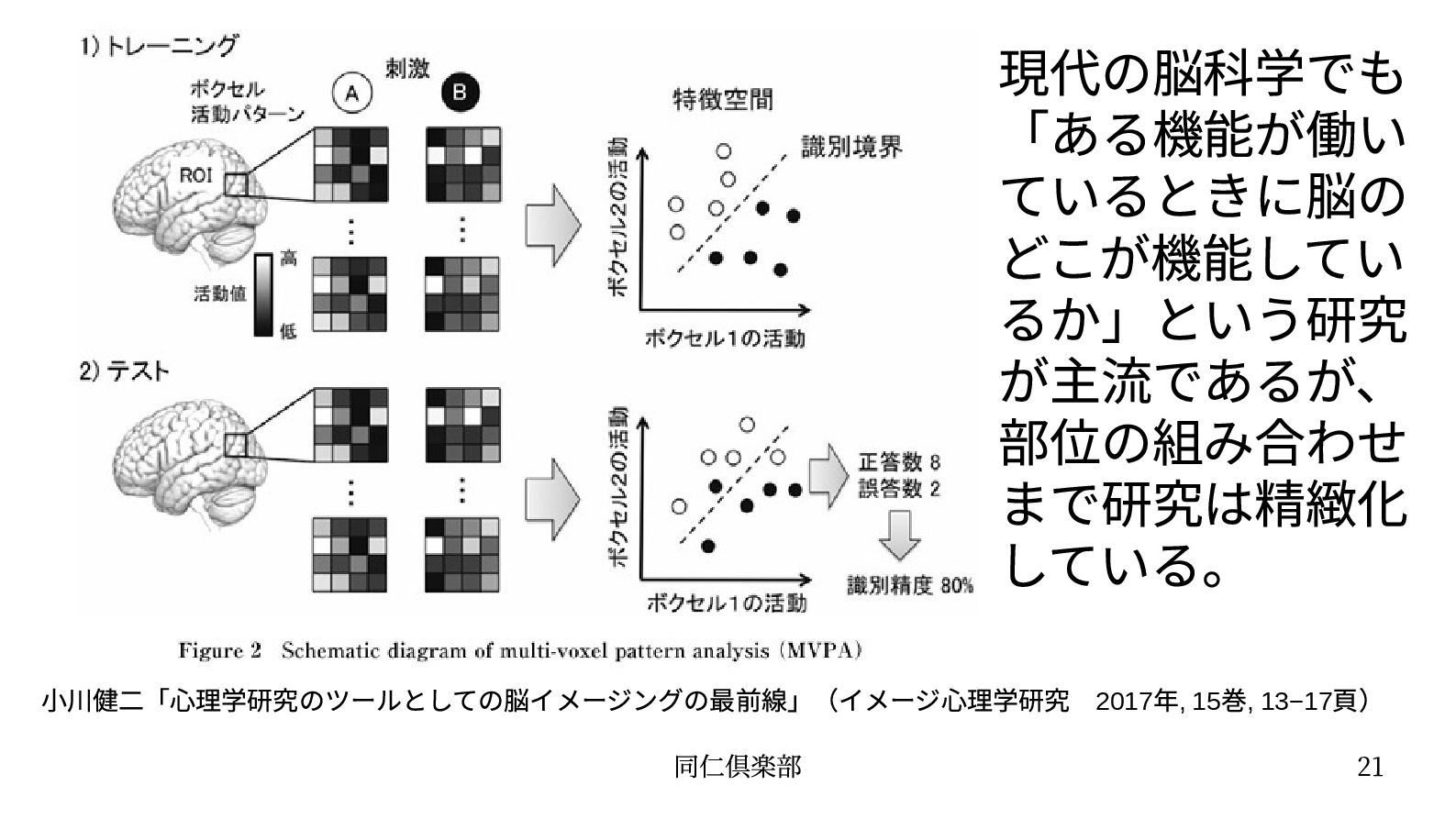 同仁倶楽部 21 現代の脳科学でも 「ある機能が働い ているときに脳の どこが機能してい るか」という研究 が主流であるが、 部位の組み合わせ まで研究は精緻化