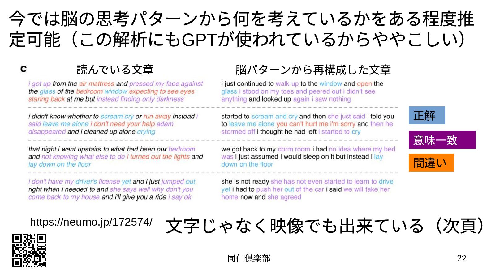 同仁倶楽部 22 今では脳の思考パターンから何を考えているかをある程度推 定可能(この解析にもGPT が使われているからややこしい) https://neumo.jp/172574/ 文字じゃなく映像でも出来ている(次頁) 読んでいる文章 脳パターンから再構成した文章 正解