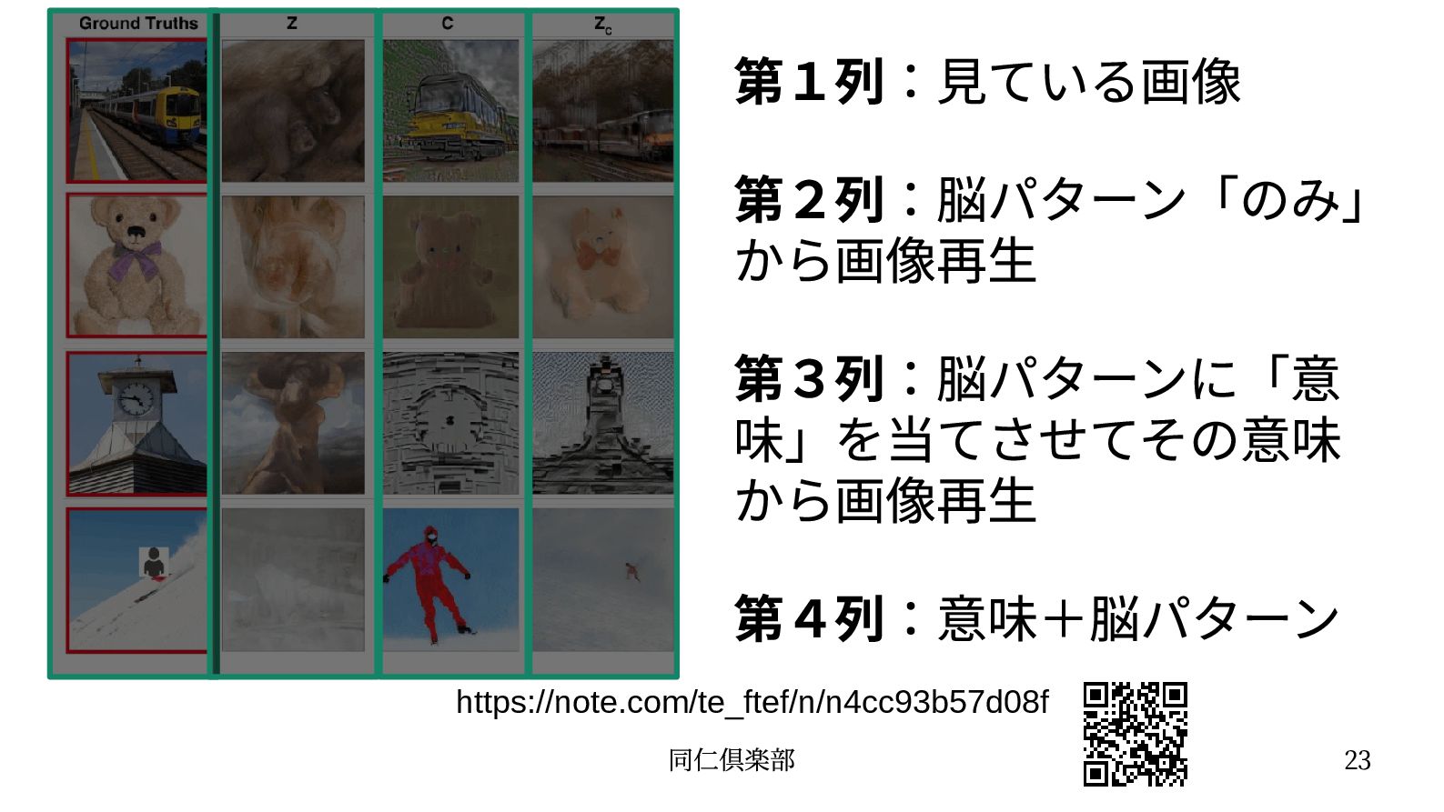 同仁倶楽部 23 https://note.com/te_ftef/n/n4cc93b57d08f 第1列:見ている画像 第2列:脳パターン「のみ」 から画像再生 第3列:脳パターンに「意 味」を当てさせてその意味 から画像再生 第4列:意味+脳パターン