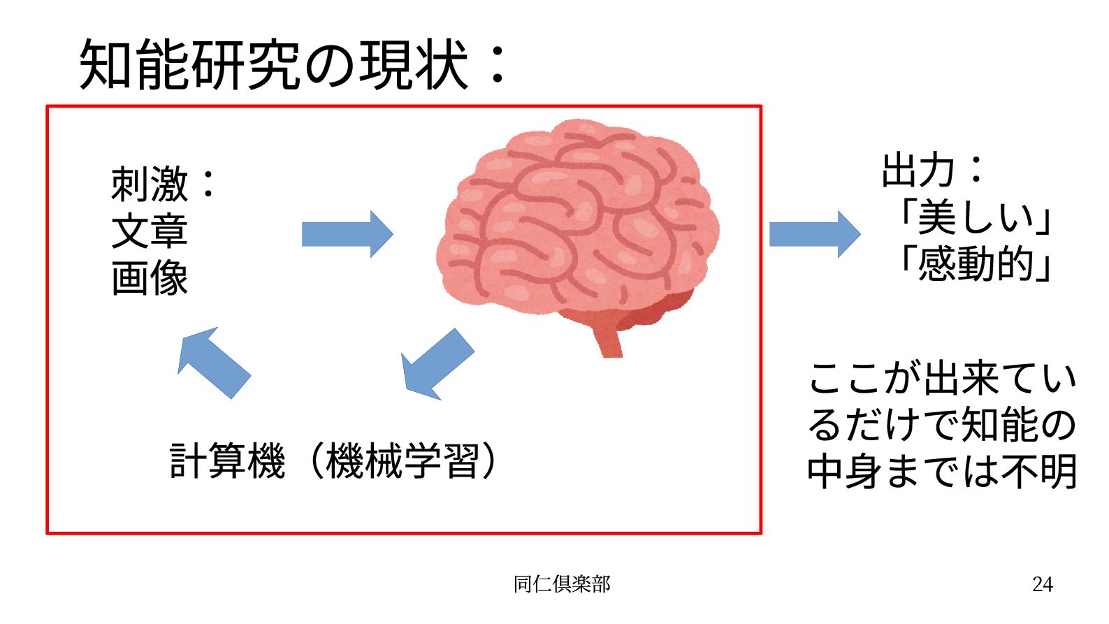同仁倶楽部 24 知能研究の現状: 刺激: 文章 画像 出力: 「美しい」 「感動的」 計算機(機械学習)
