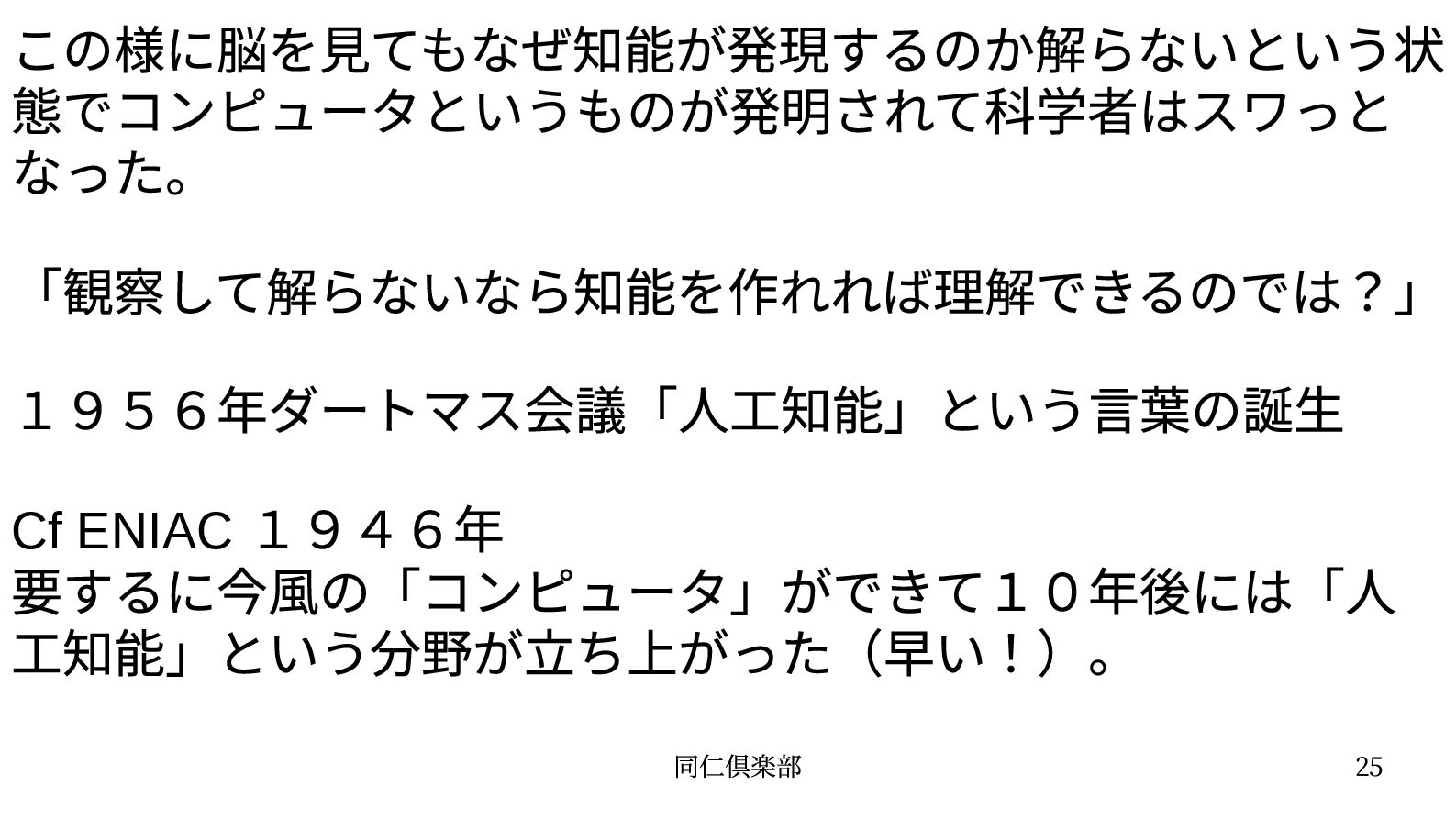 同仁倶楽部 25 この様に脳を見てもなぜ知能が発現するのか解らないという状 態でコンピュータというものが発明されて科学者はスワっと なった。 「観察して解らないなら知能を作れれば理解できるのでは?」 1956年ダートマス会議「人工知能」という言葉の誕生 Cf ENIAC 1946年