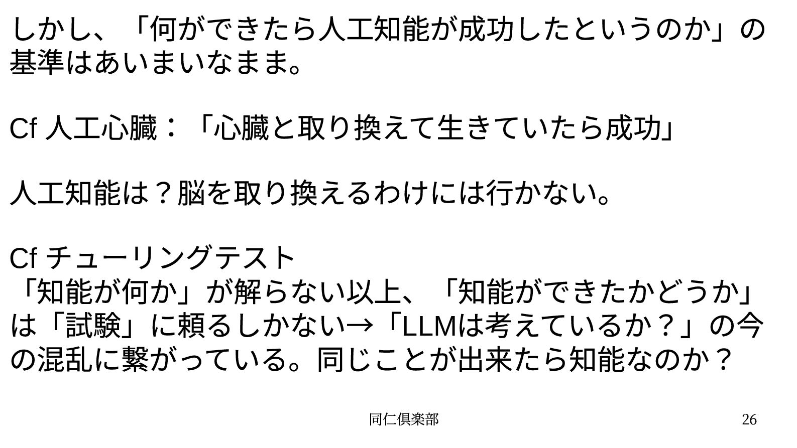 同仁倶楽部 26 しかし、「何ができたら人工知能が成功したというのか」の 基準はあいまいなまま。 Cf 人工心臓:「心臓と取り換えて生きていたら成功」 人工知能は?脳を取り換えるわけには行かない。 Cf チューリングテスト 「知能が何か」が解らない以上、「知能ができたかどうか」